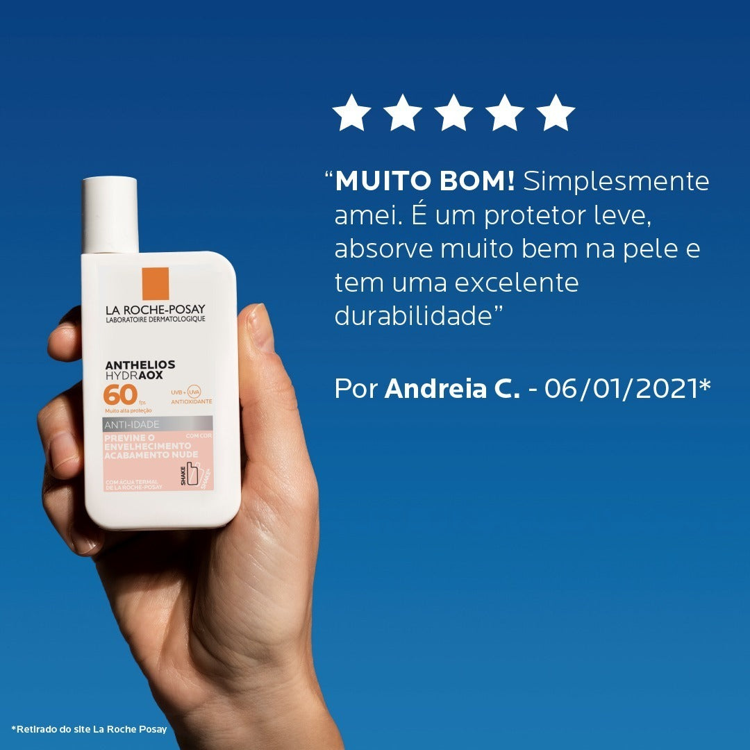 Ultra resistente à água e com acabamento nude, Protetor Solar La Roche-Posay Anthelios Hydraox disfarça as imperfeições e possui textura fluida que absorve rapidamente no rosto, sem deixar uma sensação pegajosa. Além disso, apresenta fórmula com complexo antioxidante de alta eficácia, que oferece ação Redutor de Linhas e proteção fotoestável contra os raios UVA, UVB e radicais livres induzidos por agentes externos.