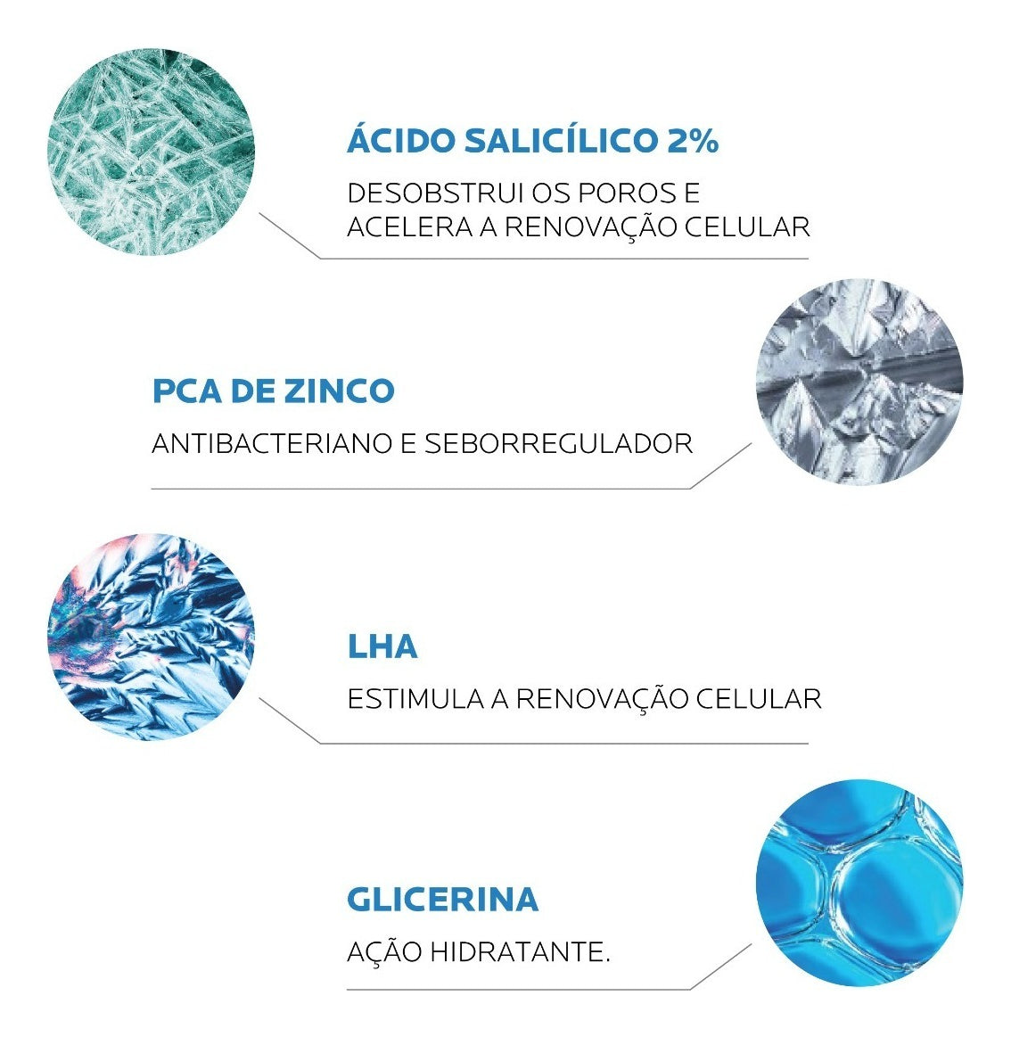 Sais de Zinco: controla a produção de queratina da pele que obstrui os poros. Assim, reduz a ocorrência de acne e regula a oleosidade.